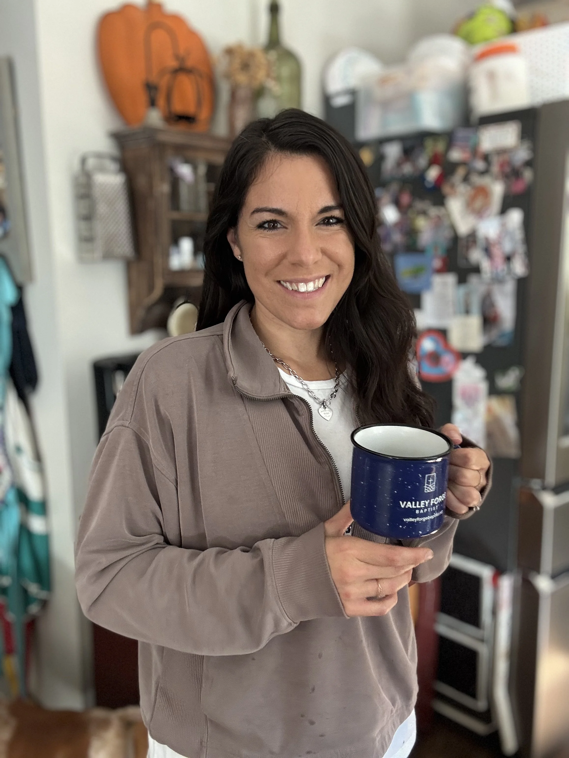 A woman smiling, holding a blue mug with Valley Forge Baptist Church logo, standing in a room with a black refrigerator, notes, photos, and a wooden wall shelf in the background.